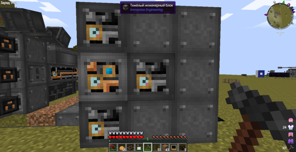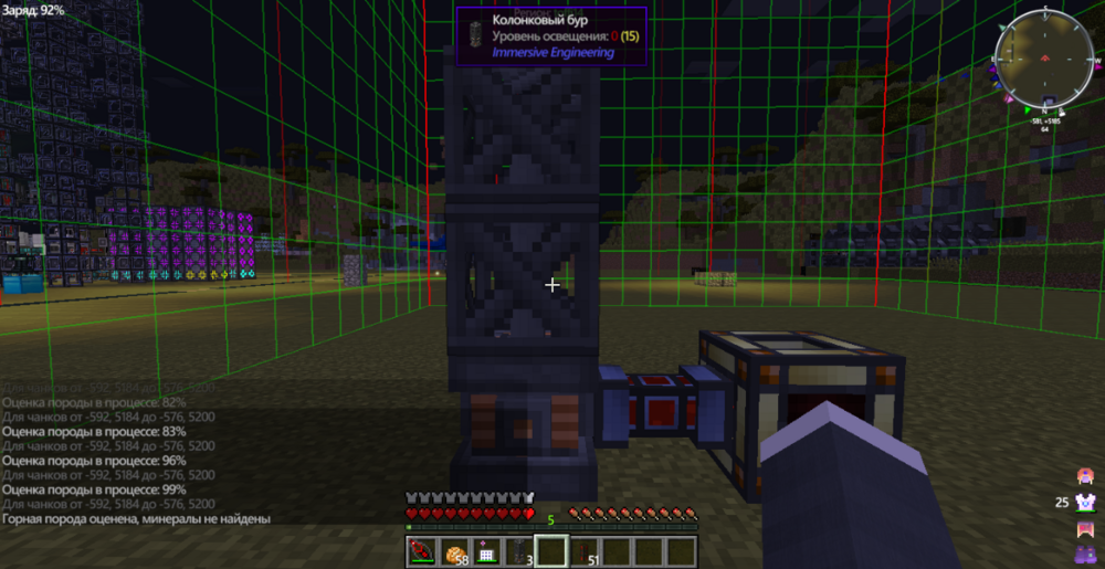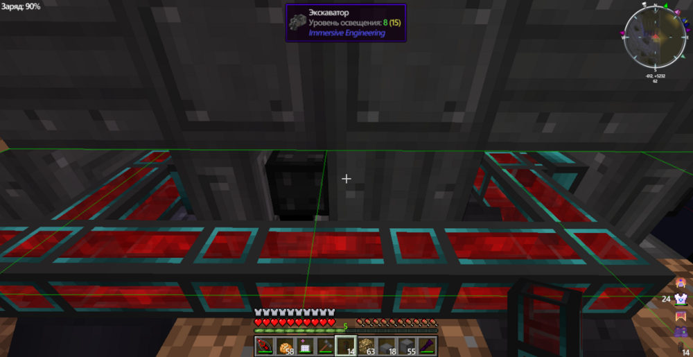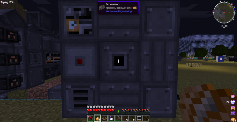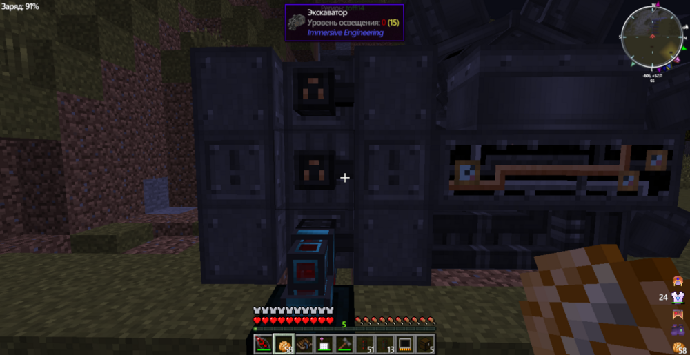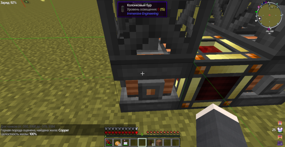 Всем привет, наверное многие задаются вопросом, как же добыть большое количество ресурсов на сервере за несколько часов? В этом нам поможет Экскаватор из мода Immersive Engineering с помощью которого мы сможем добывать до 40 тысяч руды. Для начала нам понадобиться колонковый бур. Скрафтив бур, размещаем его на землю(обязательно чтобы он стоял на блоке) Подключаем к нему энергию и если пошла анимация, значит всё сделано правильно. Через некоторое время, он закончит работу(проверить сколько осталось можно нажав по нему правой кнопкой мыши) и после завершения мы сможем посмотреть, находятся ли в этом чанке какие либо ресурсы. Как мы видим, в этом чанке никаких жил не оказалось. Это значит что нужно сломать бур, и перейти в другой чанк(проверить место чанков можно на кнопку f9) Исследование чанков, дело медленное, но его можно ускорить, если проверять сразу 4 чанка, сделать это можно, если поставить всё как на снимке. После того как всё таки нам удаётся найти чанк в котором есть ресурсы, в чате будет такое сообщение В нём написано какой тип ресурсов находиться в данном чанке, и насколько она целая (всегда 100%, но может быть что кто то уже копал тут) Дальше будет название всех жил которые есть, и какие ресурсы в ней находятся Когда же мы нашли чанк, в котором есть нужные нам ресурсы, нужно приступать к постройке самого экскаватора. Т.к. это многоблочная структура детально его постройку можно посмотреть в "руководство инженера" Тяжёлая техника --> Экскаватор. Для его работы требуется 4096 RF в тик, если же энергии не будет хватать, экскаватор будет постоянно притормаживать и работать урывками, что значительно замедляет его скорость работы. Можете сравнить как должен выглядеть правильно построенный экскаватор Если же всё правильно, подходим к стороне как на картинке, и жмём молотом инженера по блоку правой кнопкой мыши. Если всё сделано правильно, то структура должна принять свой окончательный вид. Далее нужно подключить энергию и поставить хранилище, куда экскаватор будет складывать руды. С этой стороны нужно подключить RF энергию (можно подключать как и коннекторами из Immersive Engineering так и другими трубами, которые передают RF) Сундук или иное хранилище ставим к блоку по которому мы нажимали молоточку Всё, постройка полностью готова, ваш экскаватор будет копать руду пока жила полностью не иссякнет. Дальше, если вы уже игрок среднего развития и вас не устраивает скорость добычи ресурсов, я расскажу как можно её ускорить. Делается это, путём размещения большего количества экскаваторов в чанке (да, их можно ставить больше чем один) оптимальное количество экскаваторов это 10. Конечно же на это требуется много ресурсов, так что если вы ещё не сильно развиты, оставьте эту часть гайда на потом. Для начало, нужно отступить от границы чанка по горизонтали на 4 блока После отступить ещё 2 блока по вертикали от границы чанка. Теперь роем маленькую ямку. Теперь через каждые 2 блока роем ещё 4 таких ямки. Начинаем строить ковши экскаватора заполняя с самого нижнего блока. Должно получиться 5 таких ковшей Теперь нужно вокруг этих 5 ковшей построить экскаваторы (важно, чтобы 1 блок корпуса экскаватора выходил за чанк После постройки экскаваторов, жмём молотом инженера на каждый как с первым, и если всё правильно, они принимают форму. Осталось подключить их все к рф энергии, вот тут ес