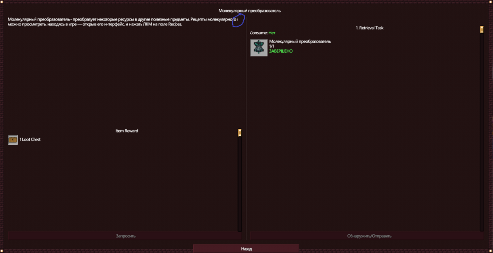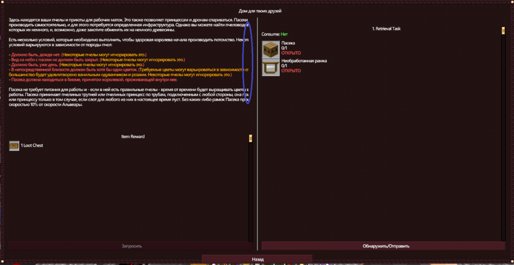 Хорошо, без лишних слов - у системы квестов очень странное форматирование текста. Он часто вылезает за пределы видимой части окна, из-за чего часто можно просто не понять о чём конкретно идёт речь. При чём, это сохраняется и на разномасштабных настройках интерфейса самого майна, и при изменении разрешения окна.